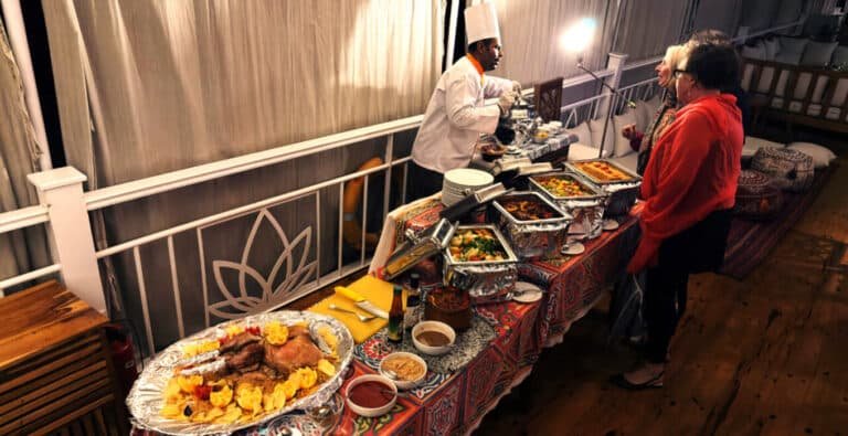 Dining aboard our Last Minute Nile Cruises maintains the same high standards as our regular departures, offering a delightful exploration of both international excellence and authentic Egyptian flavors. Breakfast and lunch typically feature lavish buffets with live cooking stations, while dinners alternate between sophisticated buffets and elegant à la carte service. Special themed evenings might include a traditional Egyptian feast with local specialties like aromatic koshari, flavorful molokhia, and delicate konafa desserts. Professional chefs use fresh, high-quality ingredients, accommodating dietary requirements with creative alternatives – with absolutely no distinction in quality despite your booking.
