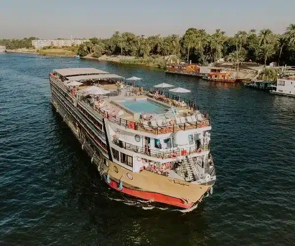 Onboard facilities include a relaxing sun deck with a swimming pool, cozy lounge areas, and a restaurant serving a selection of local and international cuisine. The cruise itinerary covers Egypt’s most famous attractions, such as Karnak Temple and Luxor Temple, the Valley of the Kings, Edfu, Kom Ombo, and Philae Temple, all guided by professional Egyptologists.