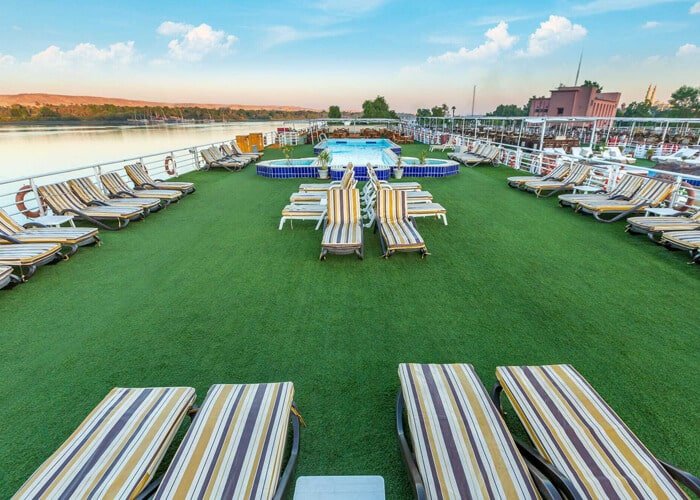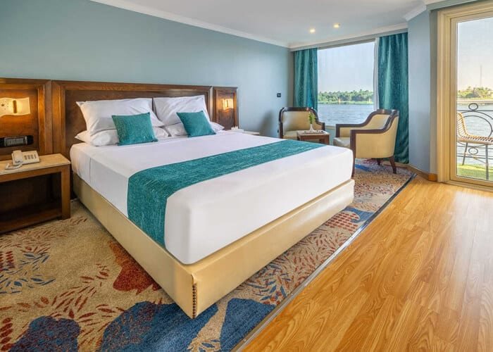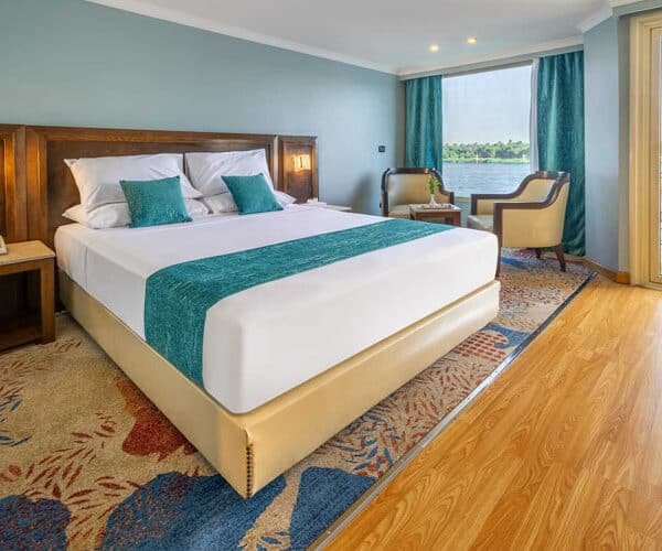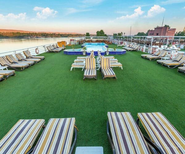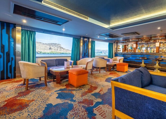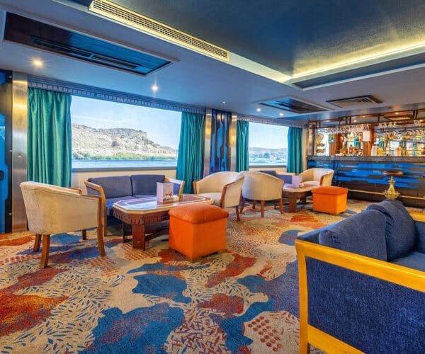 Guests can unwind in spacious, well-appointed cabins featuring large panoramic windows that provide uninterrupted views of the river and the lush landscapes along its banks. Onboard amenities include a sun deck for relaxing under the Egyptian sun, a stylish lounge and bar area for socializing, and a restaurant serving a variety of international and local cuisines.